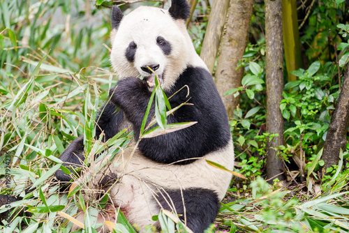 Cute Giant Panda, Ailuropoda melanoleuca or panda bear in forest at Chengdu Panda Breeding Research Center Dujiangyan. landmark and popular for tourists attractions in Chengdu, China.