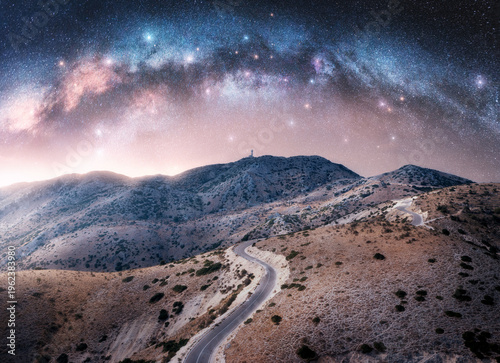 Milky Way arch and winding mountain road at night. Sky with arched milky way and bright stars in summer. Lefkada, Greece. Top view of empty road, hills. Beautiful landscape with highway, space. Travel