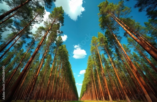 Tall pine trees grow in neat rows on a sunny day with blue sky. Forest plantation in Brazil is managed for wood production and paper industry supply.