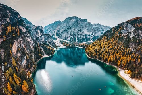 Emerald alpine lake Pragser Wildsee with dolomites mountain, rowboats and autumn pine forest in Lake Braies, Italy