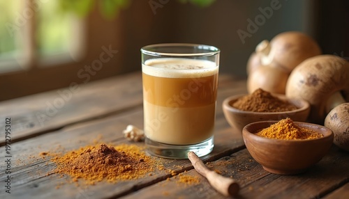 Warm latte drink with spices and mushrooms. Superfood beverage offers healthy nourishment and immune support. Natural herbal supplement for wellness lifestyle.