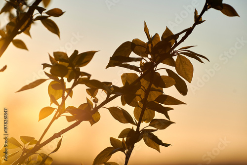 Trees, branch and sky sunrise in nature with leaves for growth, foliage and springtime in backyard. Plants, floral and botanical with morning dusk, sustainable environment and season change outdoor