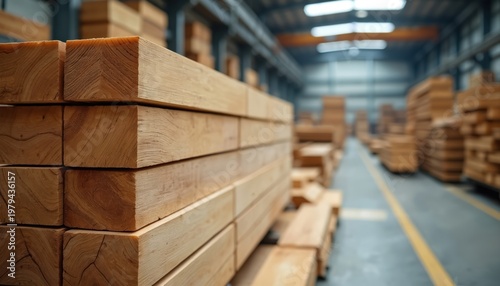 Neatly stacked light brown timber beams form geometric patterns in lumber mill. Ready for construction projects, wooden planks show natural wood grain texture. Industrial background shows raw