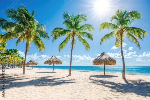Serene Tropical Paradise A Beautiful Beach Scene with Palm Trees and Shade
