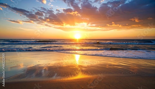 Stunning coastal sunset over ocean waves, reflecting light on the wet sandy beach
