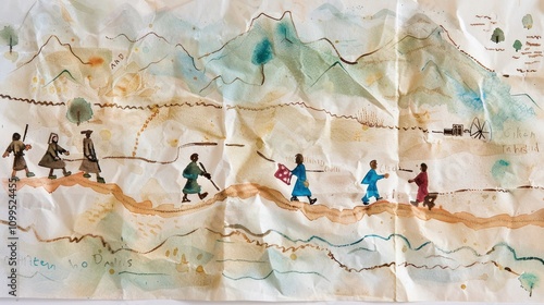 A series of watercolor depictions of biblical journeys like Abrahams journey to Canaan