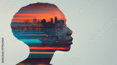 A stylized silhouette of a woman merges with a vibrant city skyline at sunset, creating a dynamic blend of urban life and personal identity.
