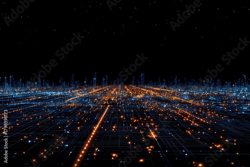 Digital landscape with glowing lights showcasing a futuristic network at night