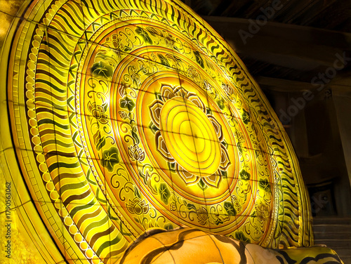 黄金に輝く円形の曼荼羅または法輪の装飾と光の抽象的な背景