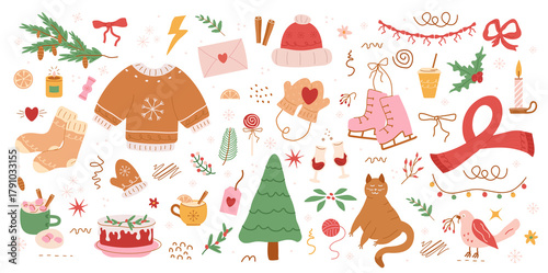 winter pattern, cute illustration. tree, stars, dots, snow, simple design. hand drawn doodles are isolated on a pink background. A trend concept for print, banner, social networks, poster. png art
