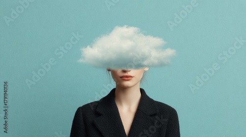 Dreamy Female Portrait Collage, contemporary art piece featuring a woman's face obscured by clouds, set against a soft pastel background, minimalist and serene atmosphere