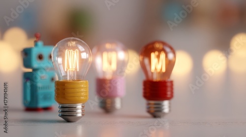 Toy robots showcasing an array of uniquely shaped light bulbs, embodying a blend of machine and cyber technology in a minimalist, clean space.