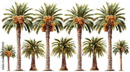 Set of date palm trees with ripe fruit clusters, isolated on a white background