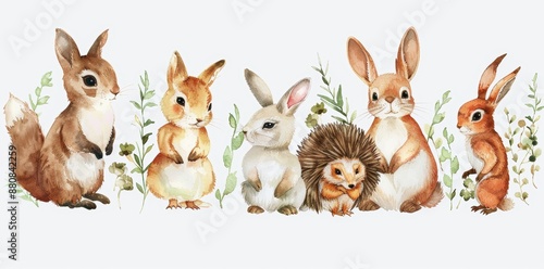 In this Safari Animal set, we have rabbits, foxes, bunnies, bears, squirrels, hedgehogs, birds, hares, raccoons, sparrows, all in watercolor style. Stock image.