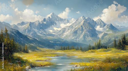 A painting of a mountain range with a river running through it