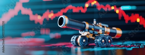 A vibrant toy cannon rests against a digital financial chart, symbolizing the explosive potential of financial analysis and market projections.