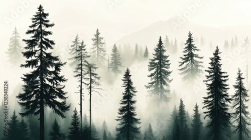 Misty Forest Landscape Showcasing Tall Trees in a Tranquil Setting During Early Morning Light