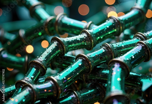 Close-up of shiny green pipes with water droplets and bokeh lights in the background