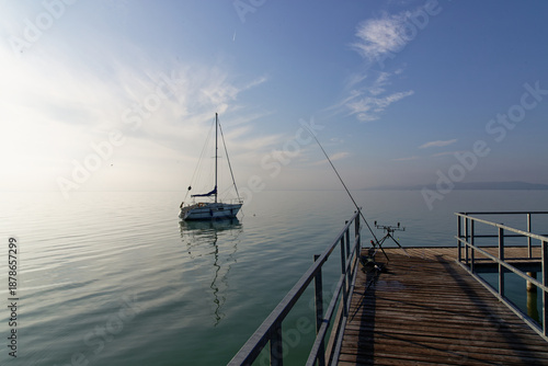 Sailboat floating on Balaton under morning light with fishing gear set near the dock