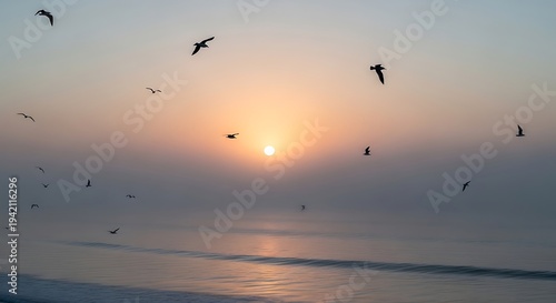 Seagulls flying over serene ocean sunset.