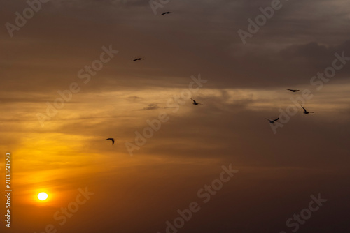 Background of a cloudy sunset at the beach with a few birds flying in the orange sky