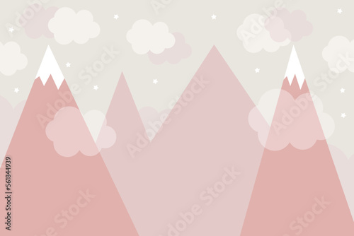Vector hand drawn wallpaper for kids. Cute mountains, clouds and stars. For a children's wall. Pink wallpaper. Cute childish design. Scandinavian style. Modern wallpaper.
