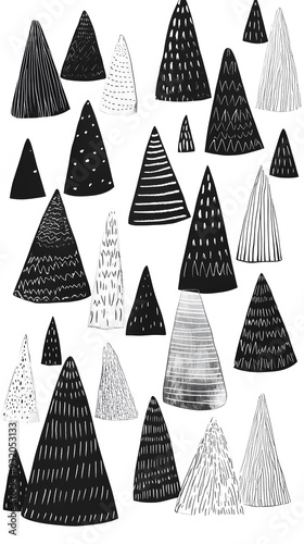 Black Shapes, Cones, Trees, Triangles, on White Background, Abstract Image, Texture, Pattern, Wallpaper, Cover and Screen of Smartphone, Cell Phone, Computer, Laptop, 9:16 and 16:9 Format