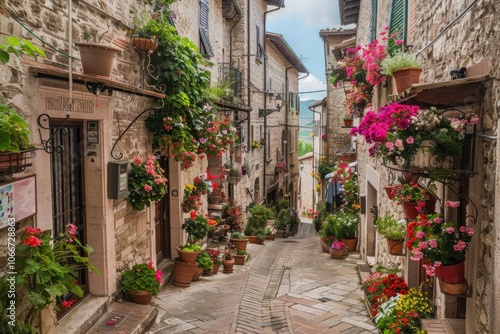 Italian Village. Exploring the Old Town of Assisi, Italy with Charming Stone Buildings and Colorful Geraniums