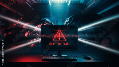 Close-Up of Computer Monitor with Red Warning Symbol and "Threat Detected" Message
