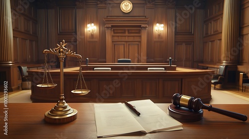 Gavel and legal documents on a judge’s desk in an empty courtroom with wooden paneling