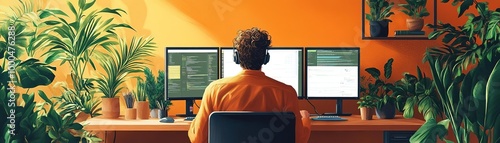 A focused individual works at a dual-monitor setup surrounded by lush green plants, creating a vibrant and productive workspace.