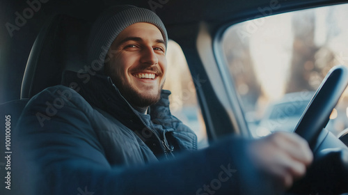 Mężczyzna siedzi za kierownicą swojego samochodu, spoglądając przez przednią szybę z szerokim uśmiechem.