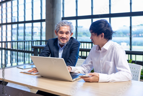 Asian senior professor is giving advice to the college student on the research thesis while sitting in the university faculty for education, academic and business