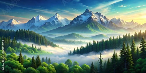 Serene illustration of majestic mountain range withsnow-capped peaks, lush green forests, and misty valleys, set