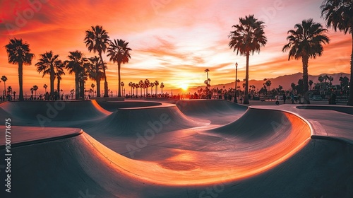 A skatepark at sunset with palm trees and a colorful sky, with people silhouetted in the distance.