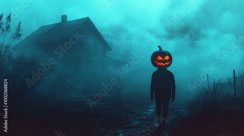 Mężczyzna z przerażającą głową dyni pojawia się w otoczeniu mrocznych domów, owianych tajemniczą, białą mgłą.
