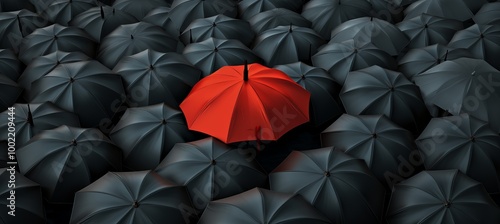 A single bright red umbrella stands out among numerous black umbrellas in a crowded space