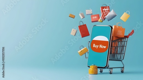 Smartphone screen featuring a Buy Now button with products magically flying out of the screen symbolizing the speed convenience and effortlessness of modern online shopping and e commerce