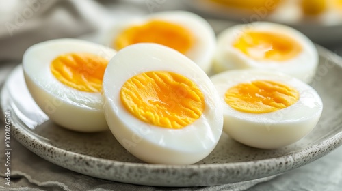 Huevos duros perfectamente cocidos y cortados a la mitad, con una yema amarilla brillante, ideales para ensaladas o aperitivos.