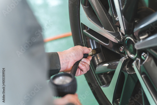 タイヤ空気圧を測定・タイヤに空気を入れる自動車整備士の手元
