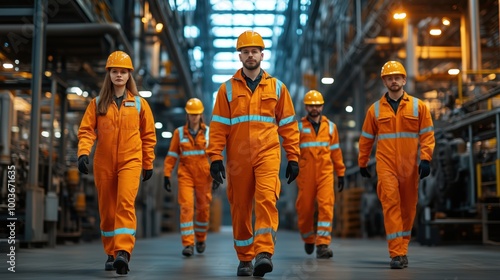 Group of workers in orange overalls and helmets confidently walking in an industrial setting, showcasing teamwork and safety in the workplace environment.