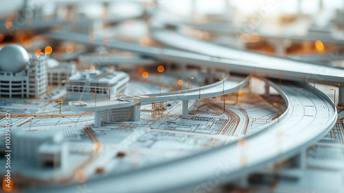 A construction drawing on the background of a model of a multi-level road, an image of the construction of a transport interchange