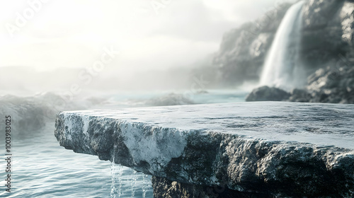 A serene landscape showcasing a rocky ledge overlooking a misty waterfall and tranquil water.