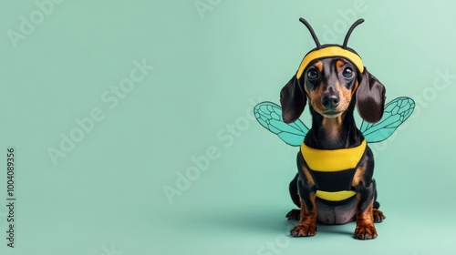 A playful dachshund wearing a bright yellow and black bee costume with transparent wings sits on a soft green backdrop, showcasing its adorable expression and unique outfit in a fun setting.