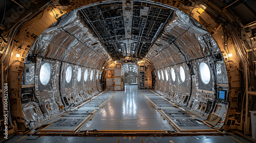 Interior view of a spacious aircraft cargo hold, showcasing detailed structure and round windows, ideal for aviation enthusiasts.