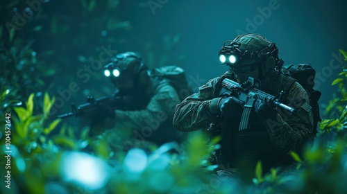 A stealthy night operation by modern special forces, equipped with night vision goggles and moving silently through a hostile environment, illustrating the precision
