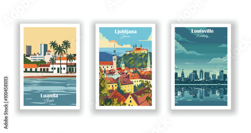 Ljubljana, Slovenia, Louisville, Kentucky, Luanda, Angola - Vintage travel poster. Vector illustration. High quality prints