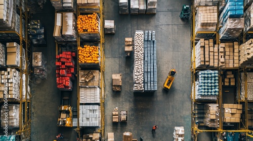 Aerial view of a busy warehouse filled with organized stacks of boxes and goods during daylight hours