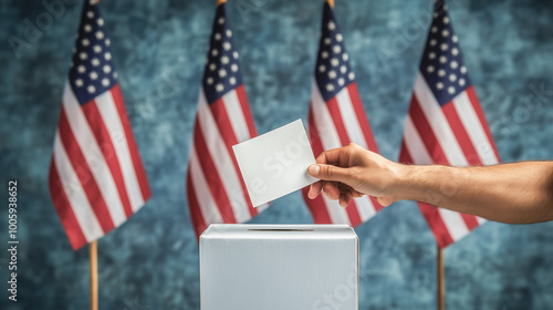 .Hand of a person placing a paper ballot into a ballot box with American flags in the background, representing democratic elections and civic participation.