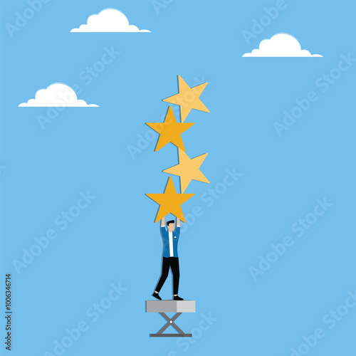 Working under high pressure, best quality requirement, perfectionism concept, Businessman carrying five stars aligned vertically on his back with fatigue